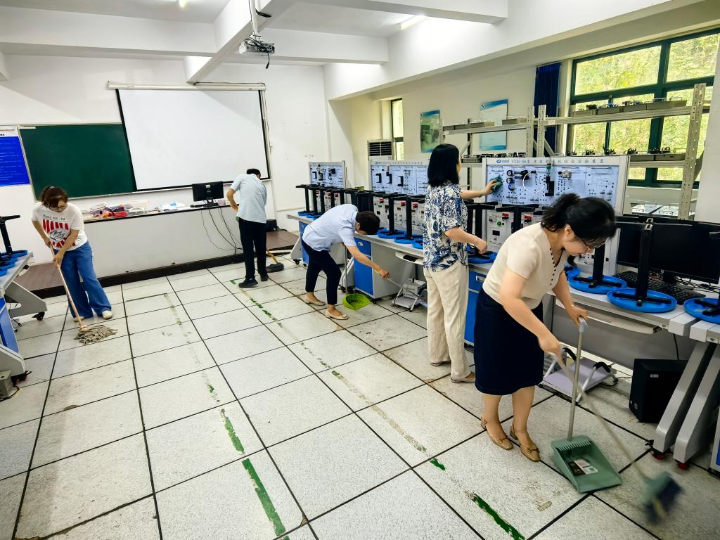 秋光潋滟映窗明,新学伊始万象清。在这天高云淡的初秋时节,人工智能学院领导班子携全体教职工,开展了一场别开生面的实训室设备检查与环境卫生清扫工作,以最美的姿态迎接学子归来。
