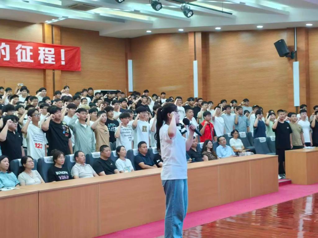 青春因誓言坚定,梦想靠奋斗闪耀。在师生见证下,典礼进入新生宣誓环节。副班主任沈慧敏领誓,全体新生起立握拳,庄严宣读誓词。