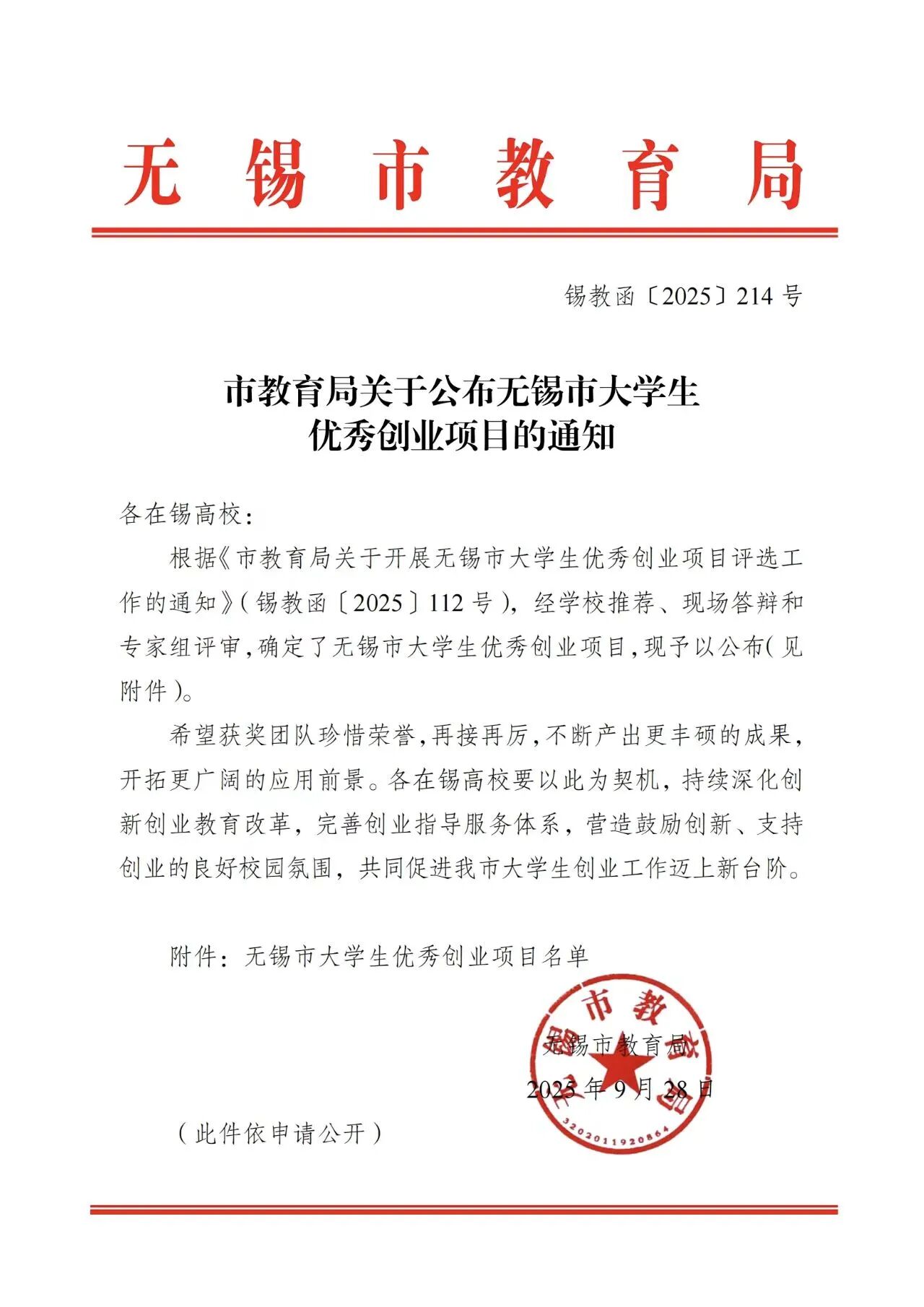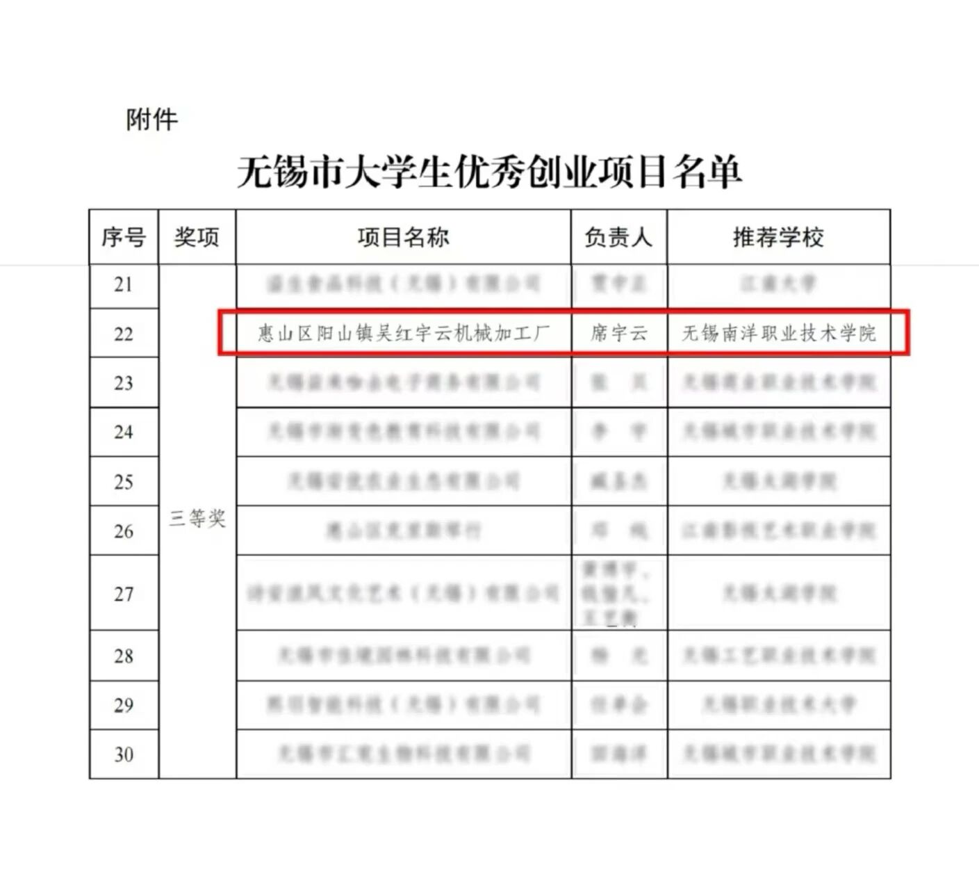 近日,无锡市大学生优秀创业项目评选结果正式揭晓,人工智能学院2024届电气212班毕业生席宇云凭借项目 “惠山区阳山镇吴红宇云机械加工厂” 脱颖而出,荣获无锡市大学生优秀创业项目三等奖,并将获市教育局资金奖励,助力项目更好服务地方高质量发展。这既是对席宇云同学创业能力与实践精神的高度认可,也为学院创新创业教育成果再添亮眼一笔。