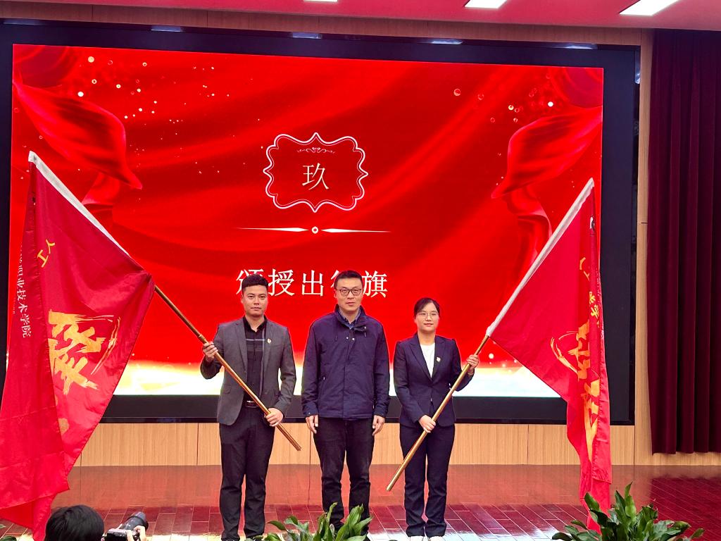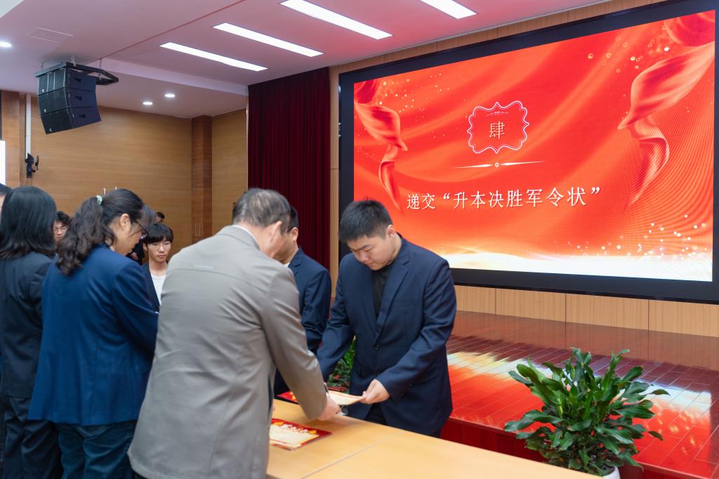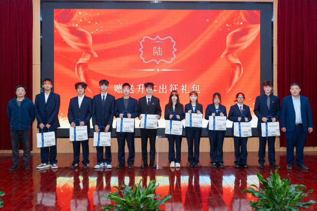 在领导充满力量的话语中,本科“超越”班班主任胡建超老师与“锋芒”班班主任王顺锋老师从学校发展部柳斌副部长手中接过“本科班出征战旗”。旗帜挥舞间,不仅承载着学校对升本攻坚的殷切期许,更凝聚着对两班学子逐梦前行的坚定支持。