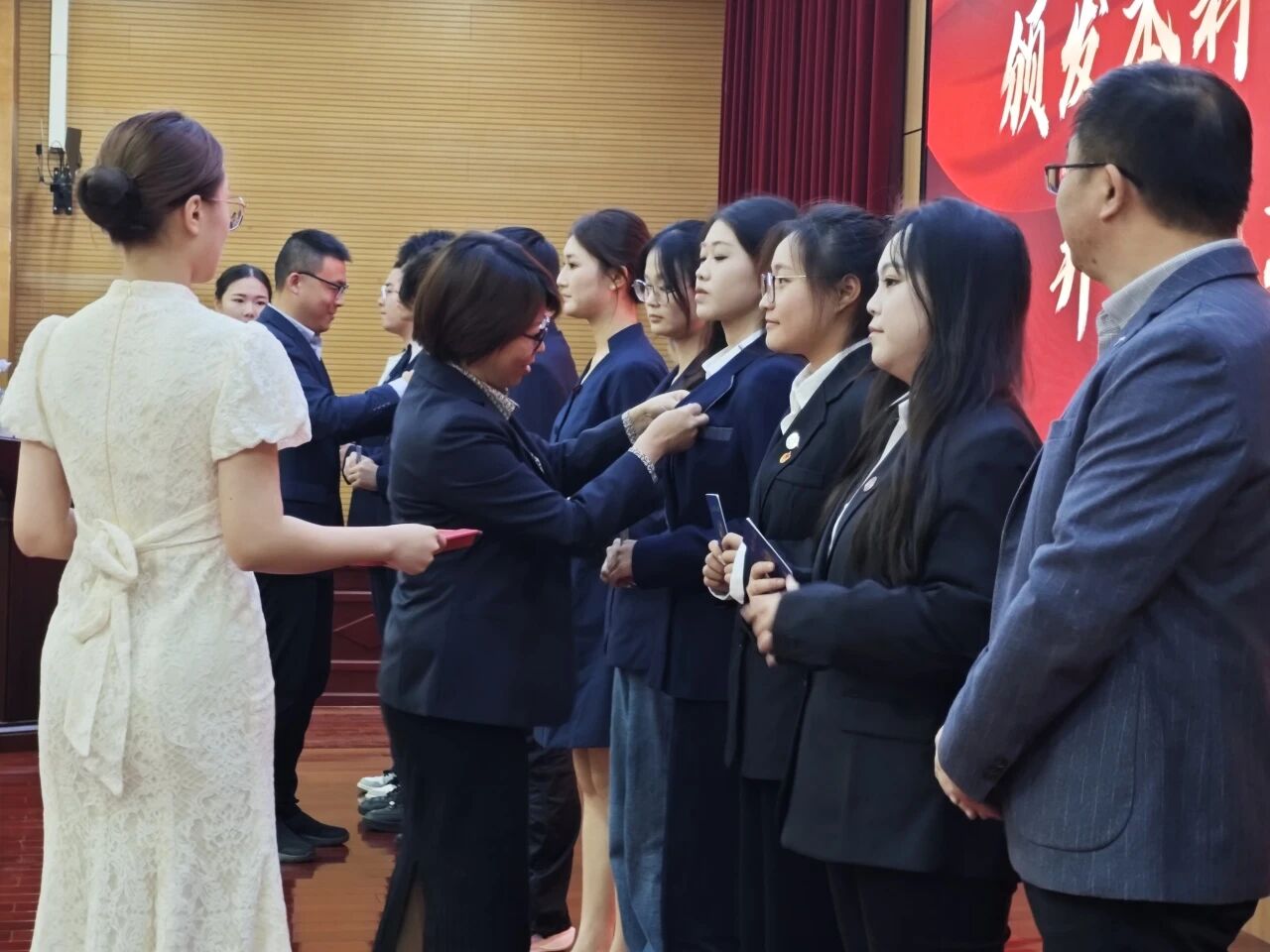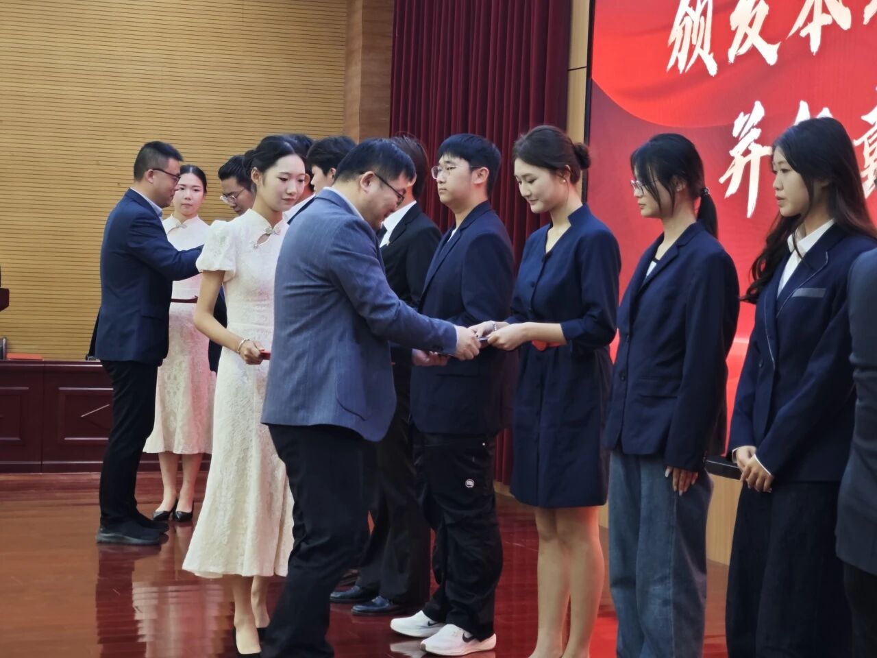 南京理工大学继续教育学院院长助理史炯煜,我校教务部部长郭春燕、发展部副部长柳斌,共同为2025级本科新生代表颁发学生证,赋予他们崭新身份的认可。