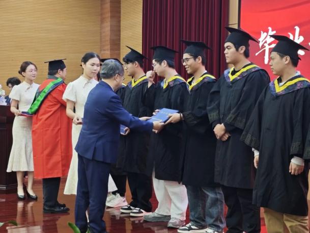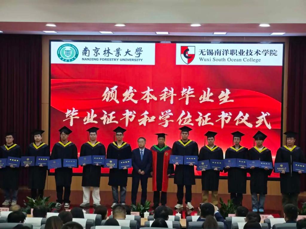 南京林业大学原继续教育学院院长李化俗、我校副校长王刚共同为本科毕业生代表颁发毕业证书与学位证书,并为毕业生拨穗。