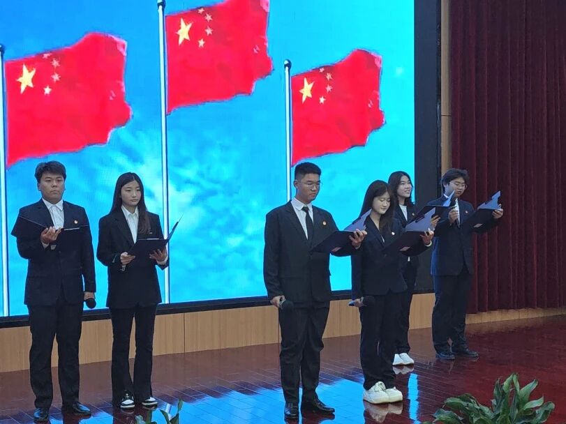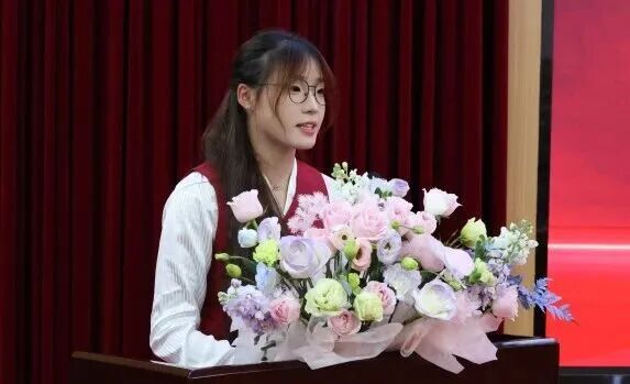 我校李彬彬同学代表2025级本科新生发言,她首先感谢学校提供了优质的学习平台,并对所有新生发出倡议:携手共进,不懈努力,在新的舞台绽放光彩,实现人生梦想。