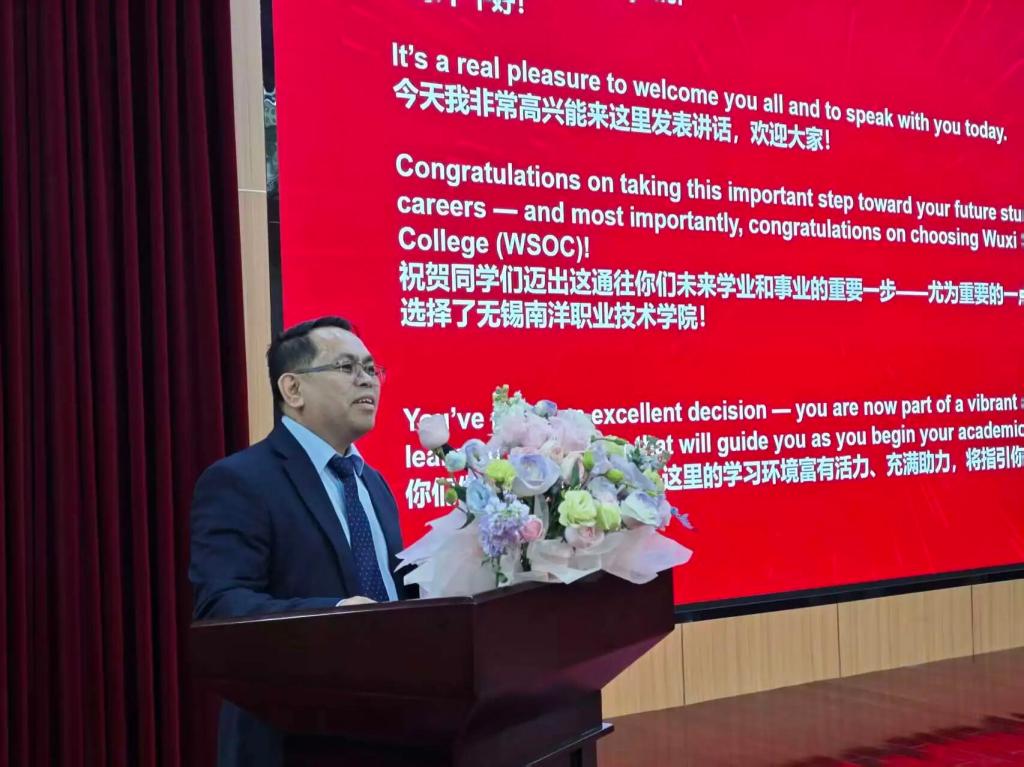 随后,江南大学继续教育学院院长王育红作为嘉宾代表发表致辞,他对无锡南洋职业技术学院的办学成就给予了高度评价,认为我校在职业教育领域深耕细作,形成了鲜明的办学特色,为社会输送了大量优秀人才。他同时表示,江南大学与南洋学院同处无锡、共担育人重任,赞扬南洋学院有担当、善创新、有温度,希望新生以理想为帆、勤奋为桨、合作为舟,祝愿同学们前程似锦、两校合作共赢。